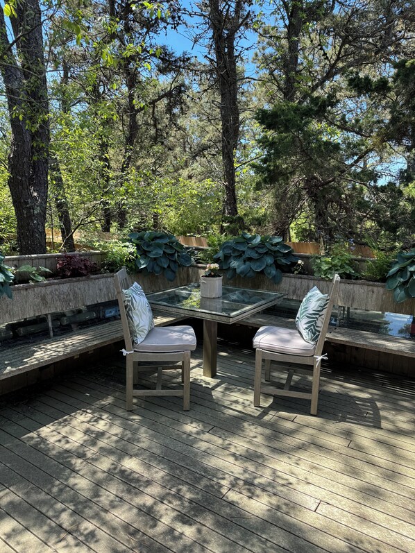 Established behind the main house off the street. This quiet little room for 1 or 2 is a perfect getaway for a stay on the island. Located mid-island, the unit is within biking distance of town and the south shore beaches. The interior room features a small under counter refrigerator, a microwave, large screen TV, desk area, a double bed and full bathroom. The exterior deck includes outdoor seating and dining under a canopy of the trees.