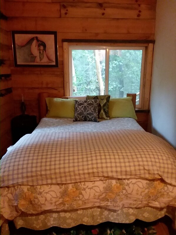 PLEASE NOTE: Geronimo Cabin does not have its own bathroom or hot water. There is a guest bathroom a short walk away at the main house with a hot shower, sink, and flush toilet, as well as clean outhouses closer to the cabins.