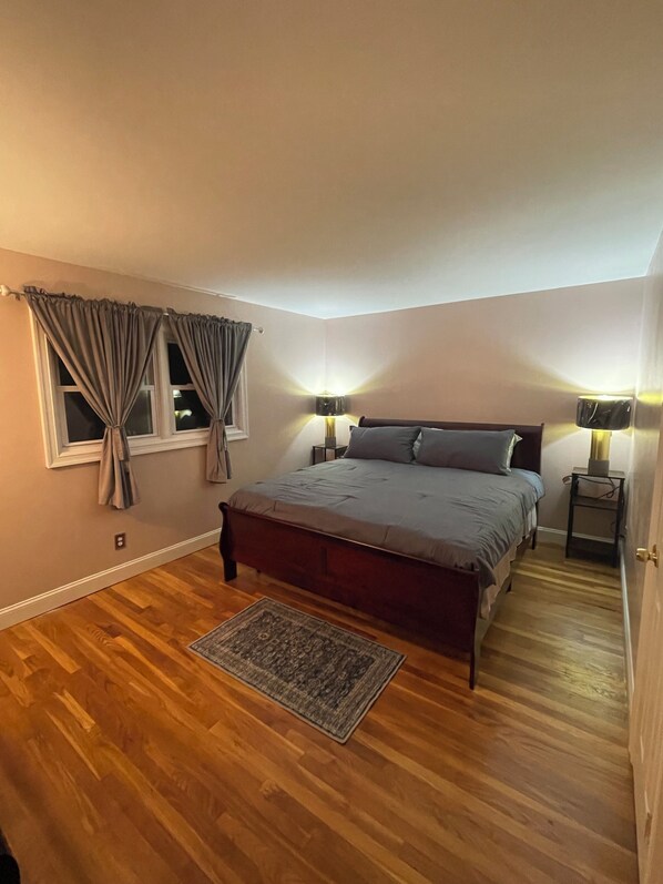 Bedroom #1 has a King size bed and a 50” smart tv. Bedroom #2 has a Queen size bed and a 50” smart tv. The living room is wide and spacious with hardwood floors, bay windows, and a 60” smart tv.
