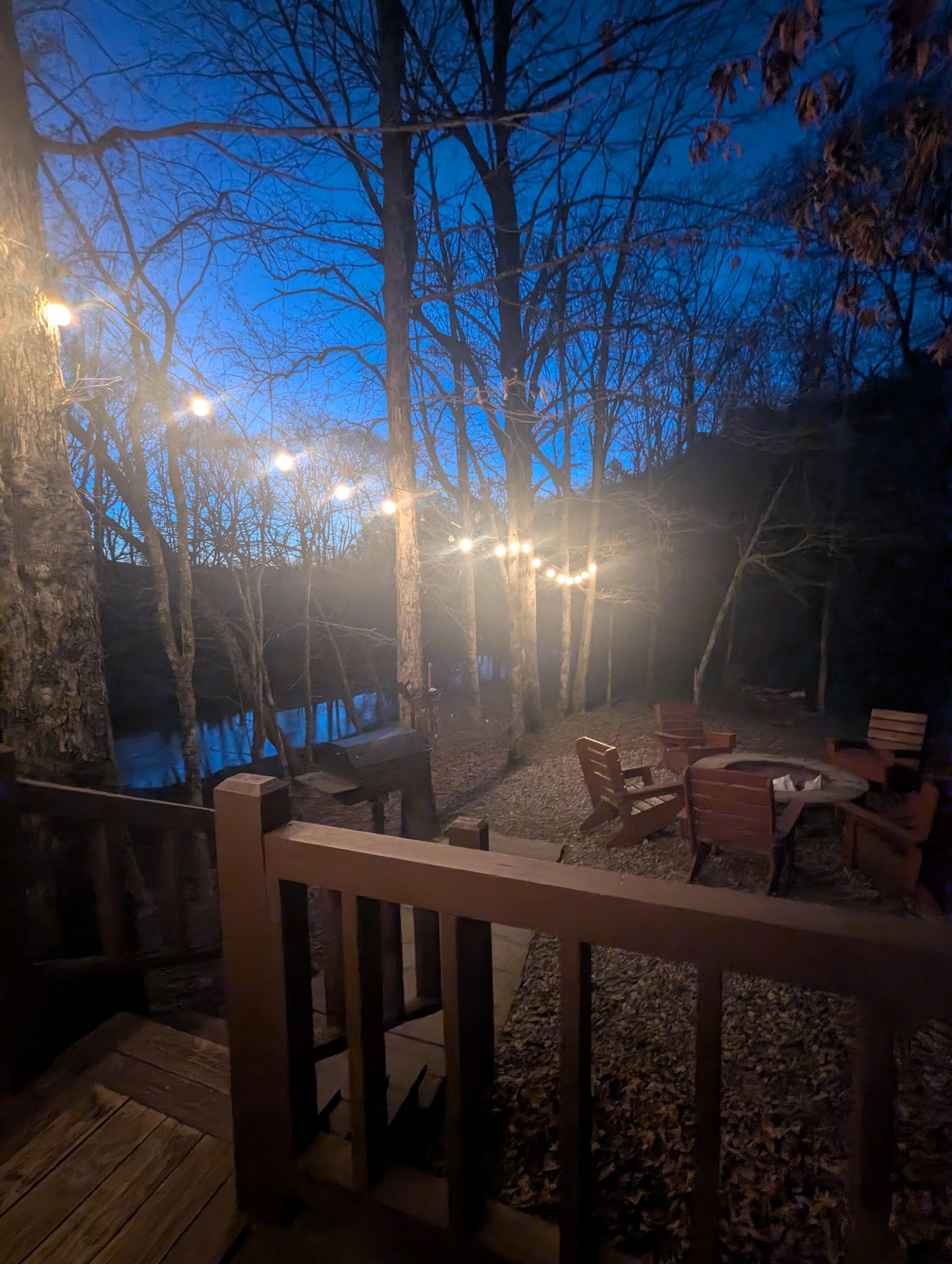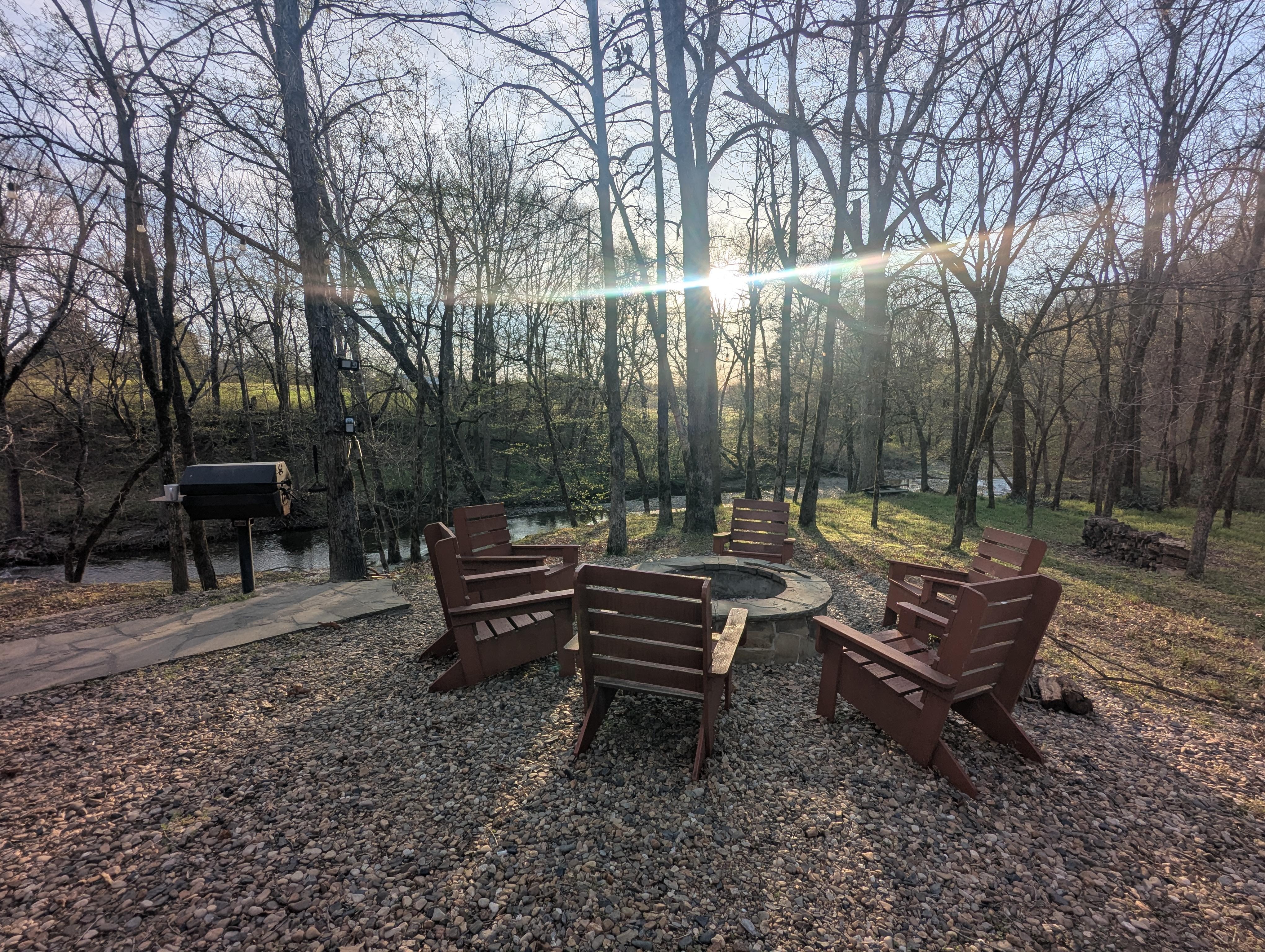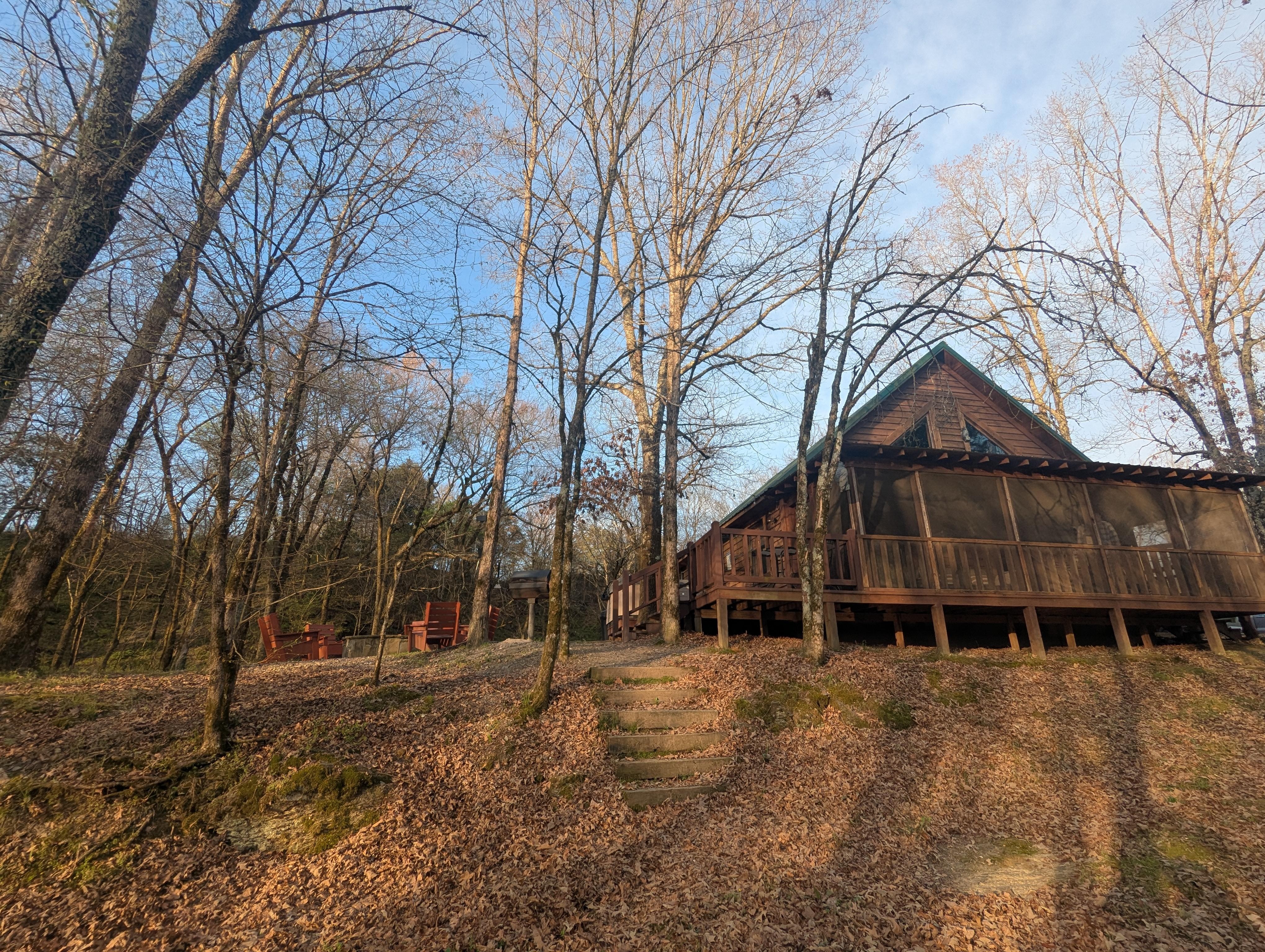 The Lost Cabin sits directly on 600 feet of the banks of Lick Creek, running the entire length of the property. The creek is spring fed and runs year round. On the back of the cabin is a screened-in porch which leads to the outside deck and a 4-person hot tub. All of these areas provide great views of the creek. Next to the back porch is a cooking and entertainment area that includes a charcoal grill with outdoor seating, and a fire pit (wood provided). The outdoor entertainment area gently slopes down to water for easy creek access. The creek has formed a natural swimming and fishing area. The land across the dirt road is a part of Lost Cabin at the Creek property, so please enjoy the amenities there as well. The swimming hole is across the dirt road. Rushing water over the rock formation provides relaxing sounds and another great area to enjoy the creek.