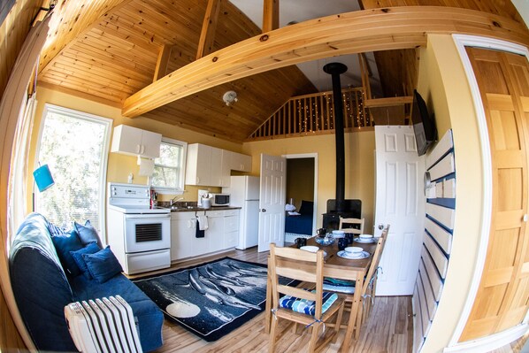 It boasts a newly renovated interior, with wood stove, fully equipped kitchen with a full size fridge.