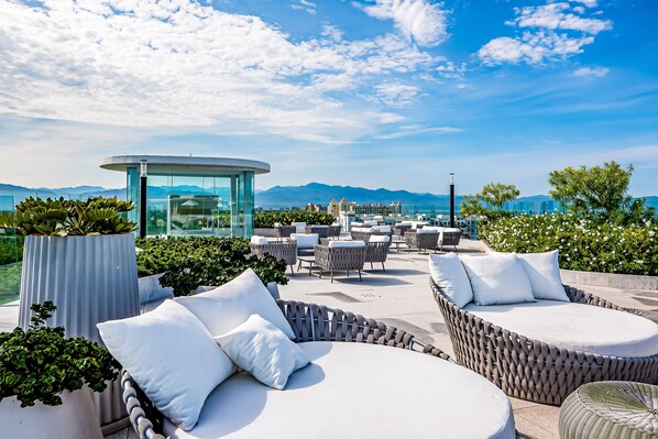 Ocean-view condo with balcony, central AC, pool, gym, cinema, & bar