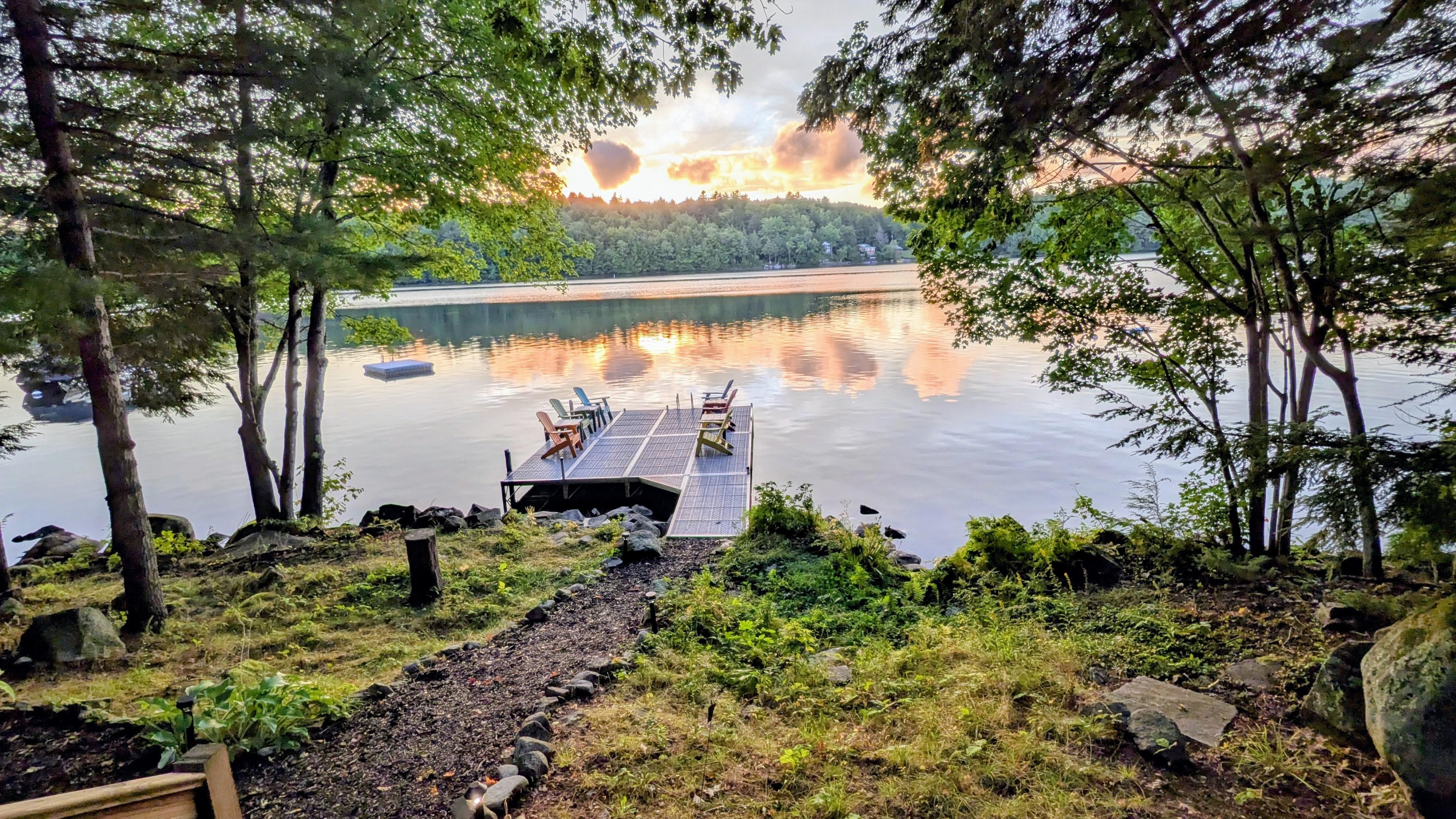Outside, enjoy the expansive dock and lake views. While other rentals have additional fees, you can enjoy four kayaks, canoe, stand up paddle boards, and fishing gear included in the price of your stay. A variety of life jackets in sizes for kids and adults are provided for lake safety. After a day on the lake, sit around the picnic table and have a BBQ on the gas grill. Enjoy the fire pit while roasting marshmallows. The house is oriented for perfect sunsets every night. Pour yourself a nice glass of wine or Maine craft beer and enjoy the view!