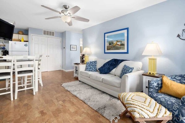 Living Area: Bright and welcoming with natural light, ceiling fans, a flat-screen Smart TV with cable, and a dining table — ideal for relaxing or spending time together ☀️