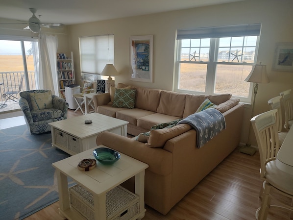 Enjoy breathtaking views of tidal wetlands, the Indian River Bridge and the bay from this amazing second floor end unit furnished condo in Bethany Bay. Bethany Bay is situated on the Indian River Bay and White Creek with water access for kayaking, canoeing, paddleboard and jet skis. The community also has a large outdoor pool, kiddie pool, tennis, pickleball, basketball, walking trails, 9 hole par 3 golf course (pay to play) and so much more. You will love the natural setting and the beautiful sunrises and sunsets plus enjoy the blue herons, egrets, deer and more. The condo is sun filled, bright and cheery with extra windows. You will find a large eat-in kitchen with white cabinetry and appliances, a spacious dining/living room with an electric fireplace, a great place to entertain or take a nap, a primary bedroom with a full bath and a guest bedroom with its own bath. You will enjoy sunsets on the front deck and early sunrises, water and wildlife views on the rear screened porch. Please checkout this fabulous condo today! Contact us for off-season rentals of a minimum 3 night stay with flexible begin and end dates.