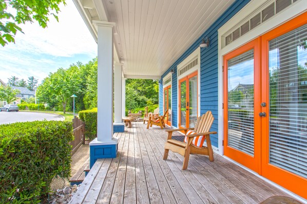 - The porch and side deck: The grand front porch runs the entire length of the house and provides a perfect spot for relaxing with your morning coffee, reading a book, or just saying hi to your neighbors walking by. The side deck features an outdoor dining table for 6 and overlooks the fire pit.
