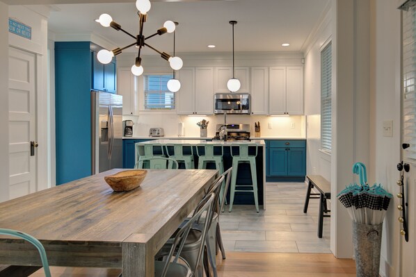 A backyard update completed in 2022 boasts lots of outdoor seating and living space, a hot tub, and fire pit for soaking in the ocean air, day and night. Inside, a beautiful kitchen remodel completed in 2023 creates a fantastic space for the chefs in your group.