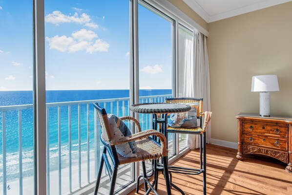 The master bedroom has a king size bed with a brand new mattress and a spectacular view of the gulf with access to the balcony. It has ceiling to the floor windows with ocean view. The 2nd bedroom has 2 QUEEN size beds. The living room has balcony ocean view with balcony access and a pull out couch with a flat screen tv. The kitchen is fully stocked for anything you would like to cook.