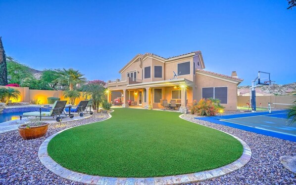 This listing is for the entire home including the private backyard with swimming pool and spa (spa heating optional w/ additional fee), patio area, gas barbecue grill, fire pit, putting green, pickleball court, basketball goal. The home is 3,835 square feet, newly furnished with modern touches and plenty of space for you to enjoy. All the essentials are provided such as sheets, blankets, towels, bath and shower toiletries and laundry supplies for your entire group. There is off-street parking available for up to 5 cars (2 garaged).