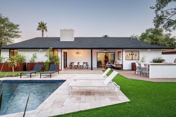 Step outside and experience your own private resort. Whether you’re teeing off on the putting green, playing a round of bocce ball, grilling by the built-in BBQ, or soaking in the sun by the pool, the backyard was made for relaxing and reconnecting. Evenings are best spent around the fire table or under the covered patio as the desert sky fades to starlight.