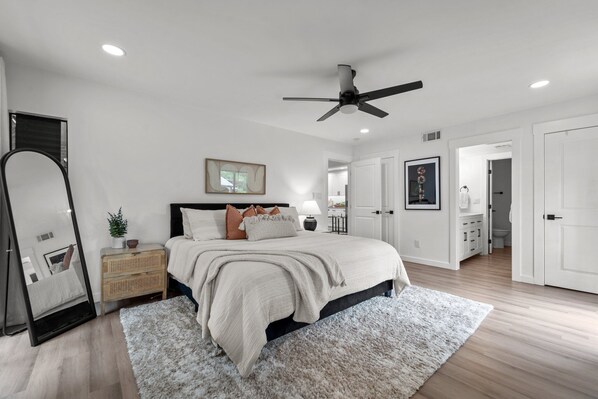 The 2 bathrooms are equipped with a hairdryer and non toxic shampoo/conditioner and body wash for added convenience. Our kitchen is fully stocked with everything you would need for a long stay so you can eat in if you choose.
