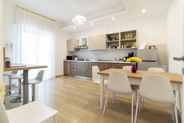 This property was located close to the Pompeii town center and appears to be new bit is clean and comfortable. There were 7 in our group, 5 adults and 2 teen girls. There are three bedrooms, one capable of sleeping 4 persons and the other two can accommodate 2 each. For 7 people, it was a little tight since the couches in the rooms served as sleeping space so had to be converted to beds each evening and back to couches in the morning. The rooms can be rented separately, in which case the kitchen is shared with others. Since we had all three rooms, we had the kitchen to ourselves. Parking for us was a problem since we had a large van that would not fit into the garage. The property manager arranged parking for us in town which cost 25 Euros per day. Not only was this a little expensive, but we had to walk about 15 minutes each time we needed to use the van. Overall we enjoyed our visit and certainly recommended it.