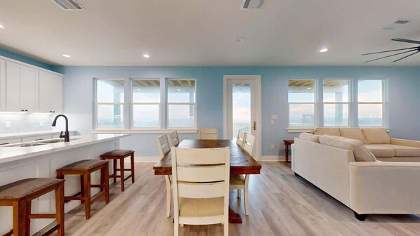With its bright coastal decor and comfortable furniture, your whole family will be able to enjoy the open great room. The kitchen is fully stocked and equipped with an extra large refrigerator and regular drip coffee pot, and there is seating for meals and games at the island and the separate dining table. The home also provides a washer and dryer, as well as high speed internet for your convenience.