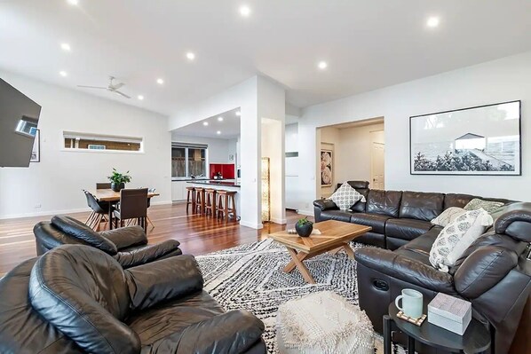 Filled with natural light, the open plan living, dining and kitchen offer leather lounge suites, 75 inch smart tv, wifi, gas heating, dishwasher, coffee machine, rain water and additional butlers kitchen. Outdoor dining is available within a private patio area equipped with weber BBQ and outdoor furniture.