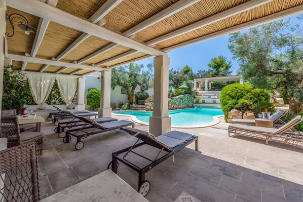 The villa "Tia Maria Country Inn - exclusive" is located in Racale and is perfect for an unforgettable holiday with your loved ones. The 385 m² property features 4 living rooms each with 2 single beds, several well-equipped kitchens—three with dishwashers—10 bedrooms, and 8 bathrooms, accommodating up to 28 guests. Additional amenities include Wi-Fi, air conditioning, heating, fans, washing machine, and TV. A cot and high chair are also available. The highlight is the private outdoor area with pool, garden, covered terrace, barbecue, and outdoor shower. Electricity is solar-powered. Recycling rules apply; more info on-site. The entire complex, with 2- and 3-bedroom apartments, a trullo, and outdoor area, is for guests’ exclusive use. Available for events and weddings upon request.