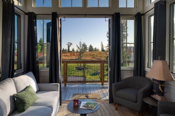 • Bedroom: a queen bed • Living Area: sofa bed, cable TV • Kitchen: fully equipped, dining table and chairs • Bathroom: walk-in shower, toiletries • Washer/dryer • Front deck