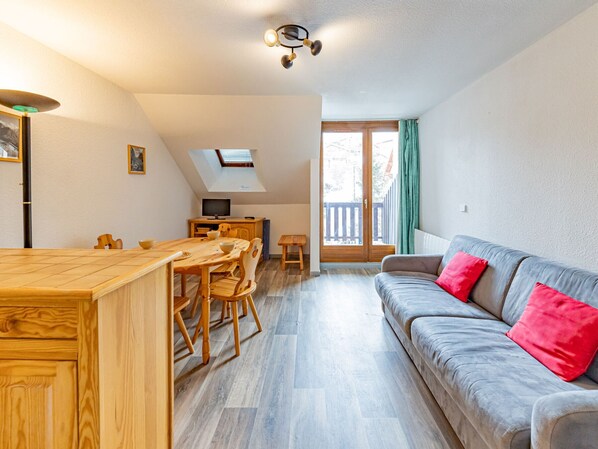 - Living room with 140cm sofa bed and flat-screen TV.