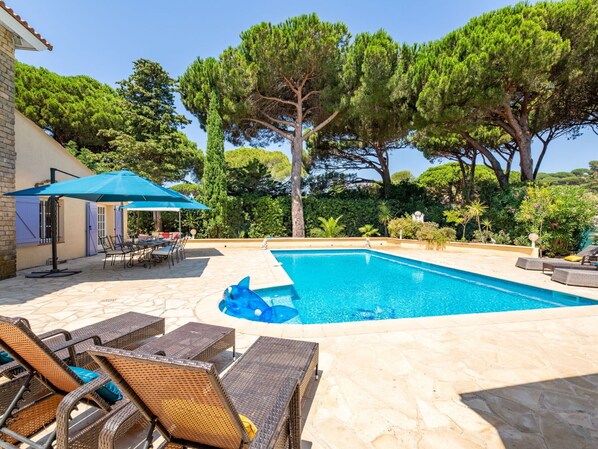 Villa "Ohana" is a cozy and comfortable holiday rental surrounded by trees in the district of de la Vierge Noire, Sainte-Maxime, France. It boasts a private property of 1'700 m2, including a fenced garden and a seasonal swimming pool (10 x 5 m, depth 150 - 210 cm) with salt water, internal staircase, and alarm system. Additionally, it offers a pool house with amenities like a fridge, shower, WC, cooking stove, table tennis, and boules. Parking is available for two cars, and the property has internet WiFi access.