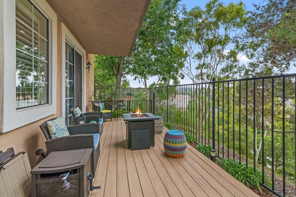 Details: • Livingroom – Access to patio, 50” TV with cable • Patio – Firepit, BBQ, seating area with deck great mountain views • Master bedroom – king bed, ensuite bath, 40”TV cable, streaming apps, access to patio from bedroom • Guest bedroom – queen murphy bed, desk when bed is put away. 30” TV • Guest bathroom in hall Washer & Dryer inside condo • Community Pool and Spa • Kitchen includes – Pots, pans, dishes, utensils, coffee pot, refrigerator/freezer, gas stove/oven, microwave • All linens included Location: 5 min from Interstate 15 3 miles from Palomar Medical Center, Poway 20 miles San Diego State University 15 miles University of California, San Diego 10 miles MCAS Miramar 20 miles to San Diego Airport 20 miles to Old Town San Diego 22 miles to Sea World 16 miles to Torrey Pines Golf Course 6 miles to Rancho Bernardo Golf Course 15 miles to Del Mar Race track