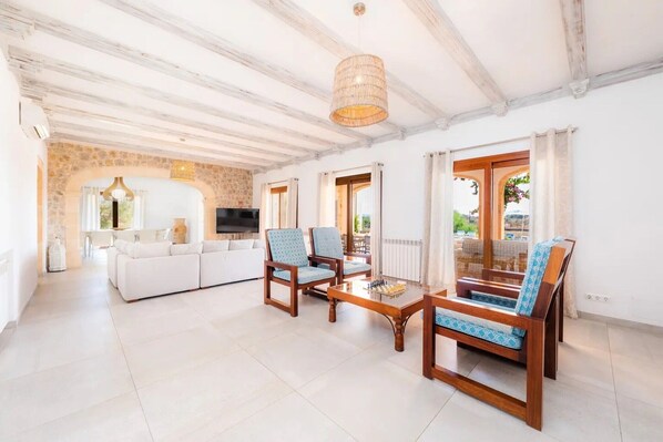 With a view of the Balearic Sea, the villa Turquesa with step-free access in Santa Margalida is perfect for a relaxing holiday. The 2-storey property consists of a living room, a well-equipped kitchen, 6 bedrooms and 6 bathrooms as well as an additional toilet and can therefore accommodate 12 people. Additional amenities include high-speed Wi-Fi (suitable for video calls) with a dedicated workspace for home office, a smart TV with streaming services, air conditioning, a fan, a washing machine, a dryer, a game console, beach/pool towels as well as children's books and toys. On top of that, a table tennis table is also provided for your enjoyment. 3 baby cots and 4 high chairs are also available. This villa features a private outdoor area with a pool, whirlpool, garden, two open terraces, two covered terraces, four balconies, a barbecue, and a playground.