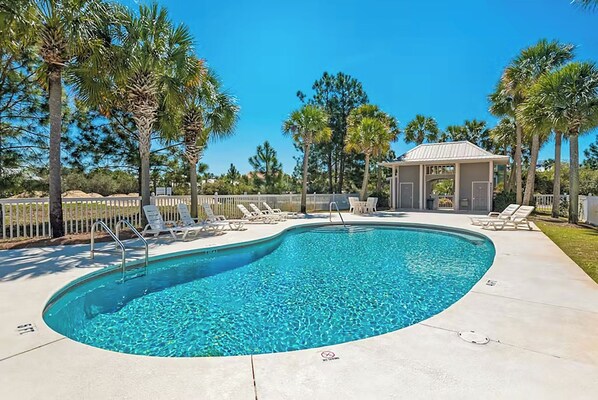 Sugar Beach is a South Walton neighborhood that resembles a tropical paradise, featuring lush landscaping throughout the community. All homes are just a short walk from a beautiful lagoon-shaped pool. The pool area is accessed through a gated, covered pergola, offering an elegant entrance with restroom facilities and showers for convenience. The sun-soaked pool patio is surrounded by tropical palm trees, providing a relaxing atmosphere for lounging. In addition to the community pool, the stunning crystalline white beach is just a short distance away. A public access point on Scenic 30A leads you to the shimmering shoreline and the emerald-toned waters of the Gulf, offering a perfect coastal retreat.