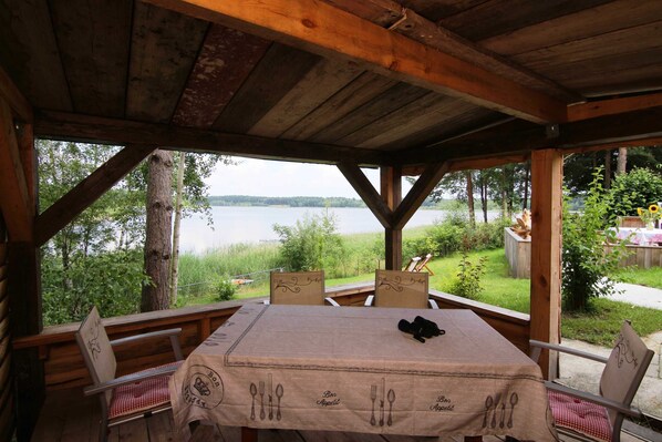 You can expect a lovingly furnished apartment. Directly on an idyllic lake in the Lausitzer Seenland. We offer the opportunity for two, in family or two families together to enjoy an unforgettable and relaxing holiday. - Fully equipped kitchen (also with microwave) - Bathroom with corner bath, shower and toilet (from 2018 a second separate bathroom with shower / WC) - Separate dining area - Winter garden - Covered wooden pavilion - Large open terrace - Own boat dock with boat - Sleeps up to 8 people - 2 separate master bedroom (one on the ground floor, one in the attic with low ceiling height) - 4 beds in the attic in the open sleeping area with low ceiling height - ideal for children - table tennis - trampolines (on request) and large playing area for Rumtollen (z , Fusball) In the summer you have space to relax on the large Freiterrasse. The covered wooden pavilion invites you to cozy barbecue huts. The spacious and light-flooded winter garden with a direct view of the lake offers a relaxing and relaxing holiday in the autumn and winter.