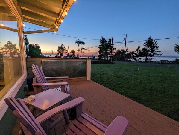 We have 7 acres of water-frontage property with a private beach and also a great firepit looking out over the bay.