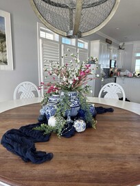 We hosted our Church's Ladies Retreat here and it was great. Rooms and Living areas were great and, of course, the View! The view and beach access was gorgeous. Oh, did I mention the huge round dining table? That was awesome!A Kuerig type coffee pot or more coffee pots would have been nice. Thankfully we had brought our own large coffee urn from the church. Decor was a blank slate so we were able to decorate and make it our own. See pics below. The house itself could use a little love on the outside and an outside garage door button would have been handy. The only other suggestion for upgrade would be to improve the stand-alone showers like the ones in the upstairs suites. You can't turn on the water without it getting on floor, no space to put shower items except on floor of shower. They are so small and out dated compared to the rest of the beautiful home. Communication with Coastal Premier Properties was excellent. I loved working with them.We appreciate the opportunity to rent your home and look forward to going there again.