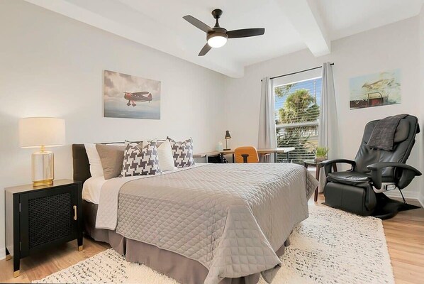 BEDROOM 2: Queen bed with office/desk space.