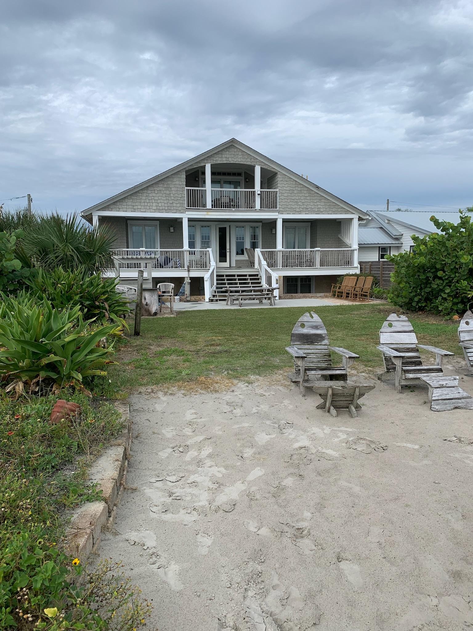 3 PORCHES - The Oceanfront porch is probably one of the best assets. There are 3. This is where you will spend most of your time so there is LOTS of seating - All Teak Wood. On the Main Level we have Rockers & Adirondacks, benches & 2 sets of table and chairs – one on the porch and the other on the Patio. There is also an Upstairs Balcony off the Pool Table room and a Stone Covered Patio on the 1st Floor with more seating and glass topped dining.