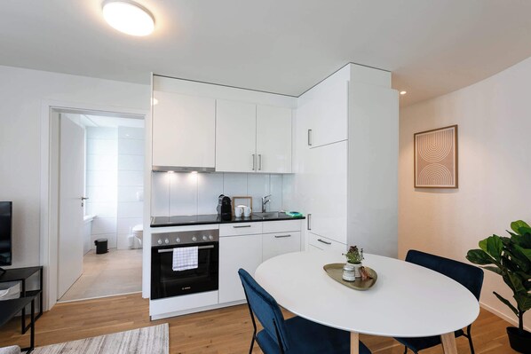 All our apartments were completely renovated in 2024. They offer a fully equipped kitchen with crockery, fridge incl. freezer compartment, dishwasher and oven. There is also a kettle, toaster and Nespresso coffee machine.
