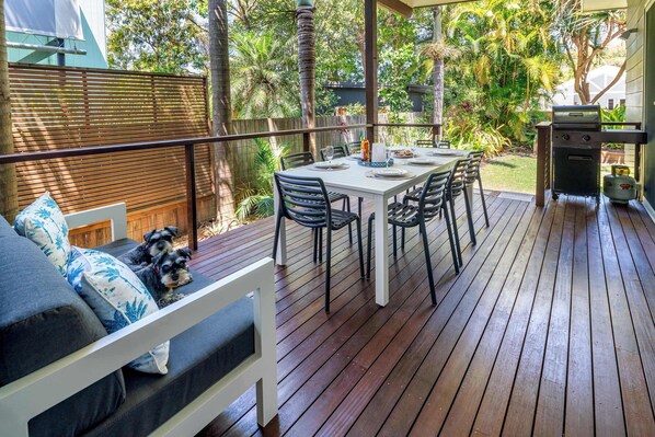 For added privacy, the second bedroom is situated away from the main living areas, providing a peaceful retreat for couples or kids. Adjacent to this bedroom, you'll find a private deck complete with a barbecue, ideal for enjoying alfresco dining and taking in the fresh coastal air. The fully secure, leafy and sunlit backyard is a pet-friendly paradise, ensuring your furry companion can enjoy the outdoors in a safe and enclosed environment.