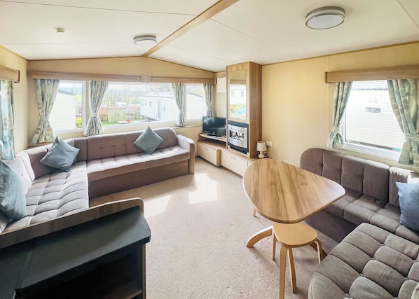 Spacious 12ft-wide family caravan with one double and one twin. Additional sleeping for two in the lounge area. Heating throughout.
