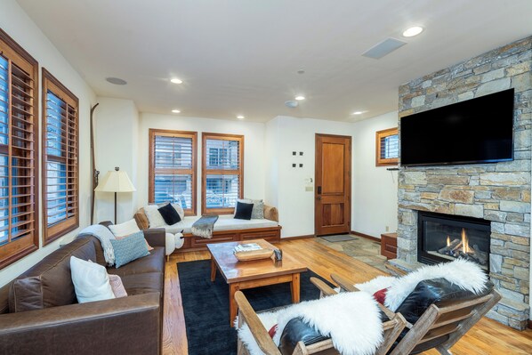 The classic front facade of South Pacific Townhouse resembles a modern Victorian— with multiple porches, steep gabled roofing, and charming scalloped siding. Guests enter the home from the south entrance, where you’ll find convenient PARKING and a large DECK with plenty of seating and magnificent views. On the main level, there’s a comfy and inviting GREAT ROOM— where everyone can gather together easily. In the LIVING ROOM, there’s a leather sofa, armchair, and a built-in window seat that overlooks the front porch. A stone fireplace and large HDTV create an ideal spot to watch your favorite TV show or simply curl up with a good book by the fire.
