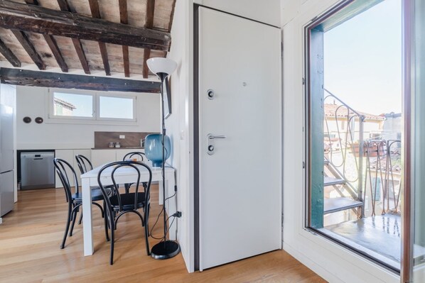 Perfect location in Venice and loved the rooftop patio. Great view over the city. Very close to the Rialto Bridge. The apartment was very difficult to find until our host sent us a video of how to find and access the apartment. It seems building numbers in Venice are not always sequential and in this case the building number was not showing. The video from our nice host fixed all that. There were problems with the on-demand hot water heater so showers were an adventure temperature-wise and it seemed the overall building water pressure affected the performance of the temperature at the shower head. Our host said he would take up that problem with the building owner for a fix. One of the hallway lights on the landing floor below us was not working so at night we needed to have our cell phone lights ready to use. Overall a wonderful place to stay if the shower water temperature gets fixed.