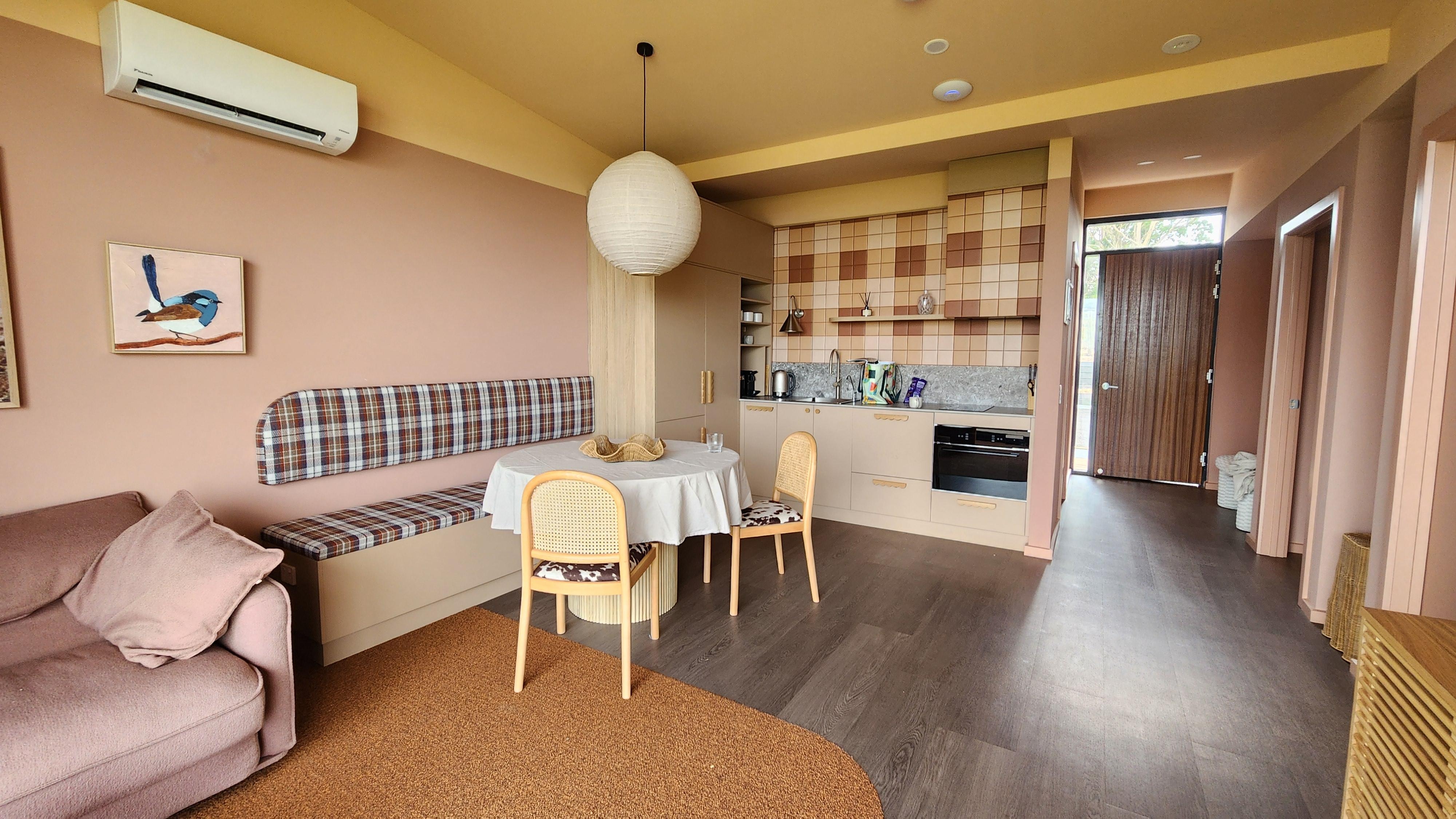 I relaxed the moment I walked in the door. Uninterrupted views across the paddocks, and valley beyond. I opened the huge glass door to the deck and was treated with delightful moos from the cows about 20 meters away. Very calming decor, with a gorgeous touch of whimsy. Very well appointed kitchenette. Could easy live there for a week. The only reason I gave a 4 instead of a 5, was the very bright blue light from the wifi hub on the ceiling. It did not help with the relaxing calm vibe. I was glad I had my eye mask with me. I think that hub is designed for an office not a bedroom. However, I certainly hope to return again next time I need get away to chillax.