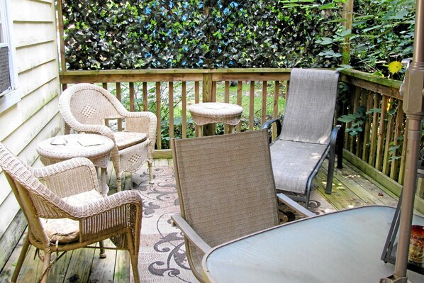 Ideally suited for two persons, bedroom features queen bed, firm mattress and 'faux' featherbed for the ultimate night's sleep. Room darkening drapes and wooden blinds. Robes provided for your comfort. Window A/C, ceiling paddle fan. Additional entrance door from side porch. All linens provided. You will find your bed made with ironed luxurious sheets! If needed, the LR sofa is loveseat-size sofa bed. A twin size fold-out bed with mattress and featherbed is also available. Cabin is small and designed with two person occupancy in mind.
