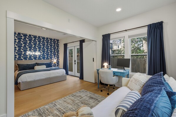 Our private tiny home feels like a fully separate home—not a guest house. Completely fenced & private from the main home; has its own entrance, yard, & living space. The flexible layout allows a bedroom to be opened into one large suite with a king bed & dedicated workspace, or divided with a wall into two sleeping areas. The daybed sleeps as a twin or converts to a king, plus a pull-out couch. Sleeps up to 6. A separate main house sleeps 9 (15 total if booked together)—inquire if interested.