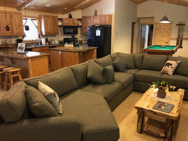 This is a newer log-style cabin, with a bright and open layout, it's big enough for the whole family. While being cozy in the winter time and airy in the summer time, this cabin is beautiful all year round. It includes three bedrooms, three bathrooms, and even has a gaming area the whole family can enjoy. This cabin features a hot tub, rock fireplace, open great room, pool table, telephone, internet, patio furniture, a large wraparound deck, a fenced in dog run and is even handicap accessible. There are TV's in the living room as well as one in each bedroom. The kitchen is fully stocked with everything needed to prepare a wonderful home cooked meal. With being less than a mile to the Village, a short hop to the lake, Alpine slide/tube run, and both ski resorts, there is something to do for everyone of all ages. This spacious cabin sleeps eight comfortably with enough room for everyone. The master suite features a California king bed with a full bathroom as well as glass sliding doors that lead out onto the deck. The second bedroom has a queen bed as well as a bunk beds with a full bathroom. The third bedroom includes a queen bed and a full wheelchair accessible bathroom. The living room also has a sofa bed. Plus a full size washer and dryer. The cabin has an attached owner private dog park. Outside security video cameras monitors the cabin when vacant. Free EV charging station on site for electric vehicles.