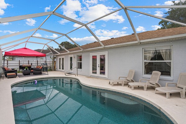 Enjoyed our November stay. The kitchen is well stocked with all the appliances you might need. It was really nice to park our car in the garage. Communications with owner was excellent. Used the laundry a couple of times since we stayed two weeks. Golf is plentiful in the area, right across the street! Lots of shopping near by. Would have liked the pool better if it was heated. Quiet neighborhood