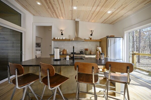 One story, open-concept living/dining/kitchen space, vaulted ceilings, floor-to-ceiling windows + sliding doors run full length of cabin, sliding doors open to 700 sq ft deck. We provide a convenient Pack and Play for your little one’s comfort, as well as a highchair to make mealtime easier during your stay.