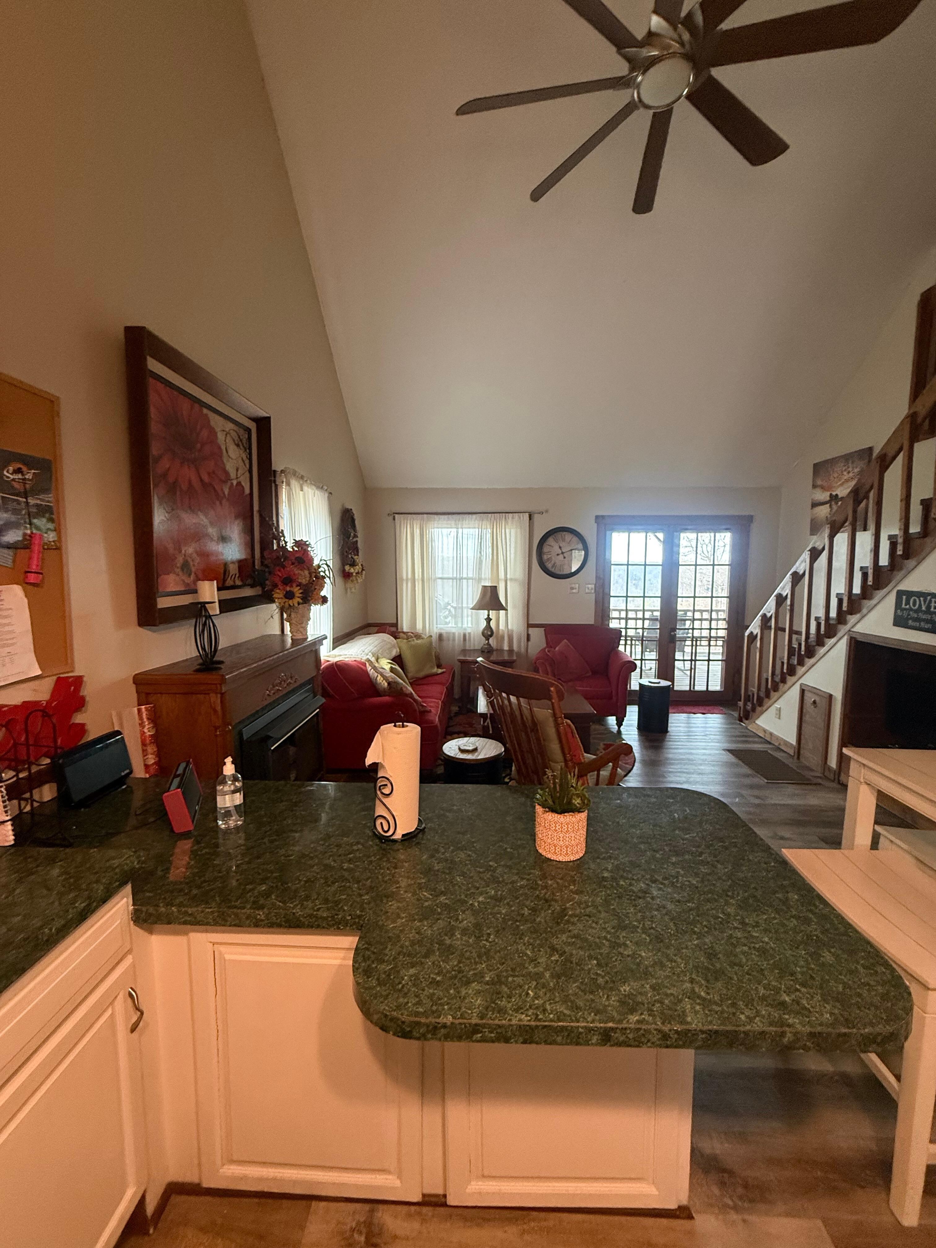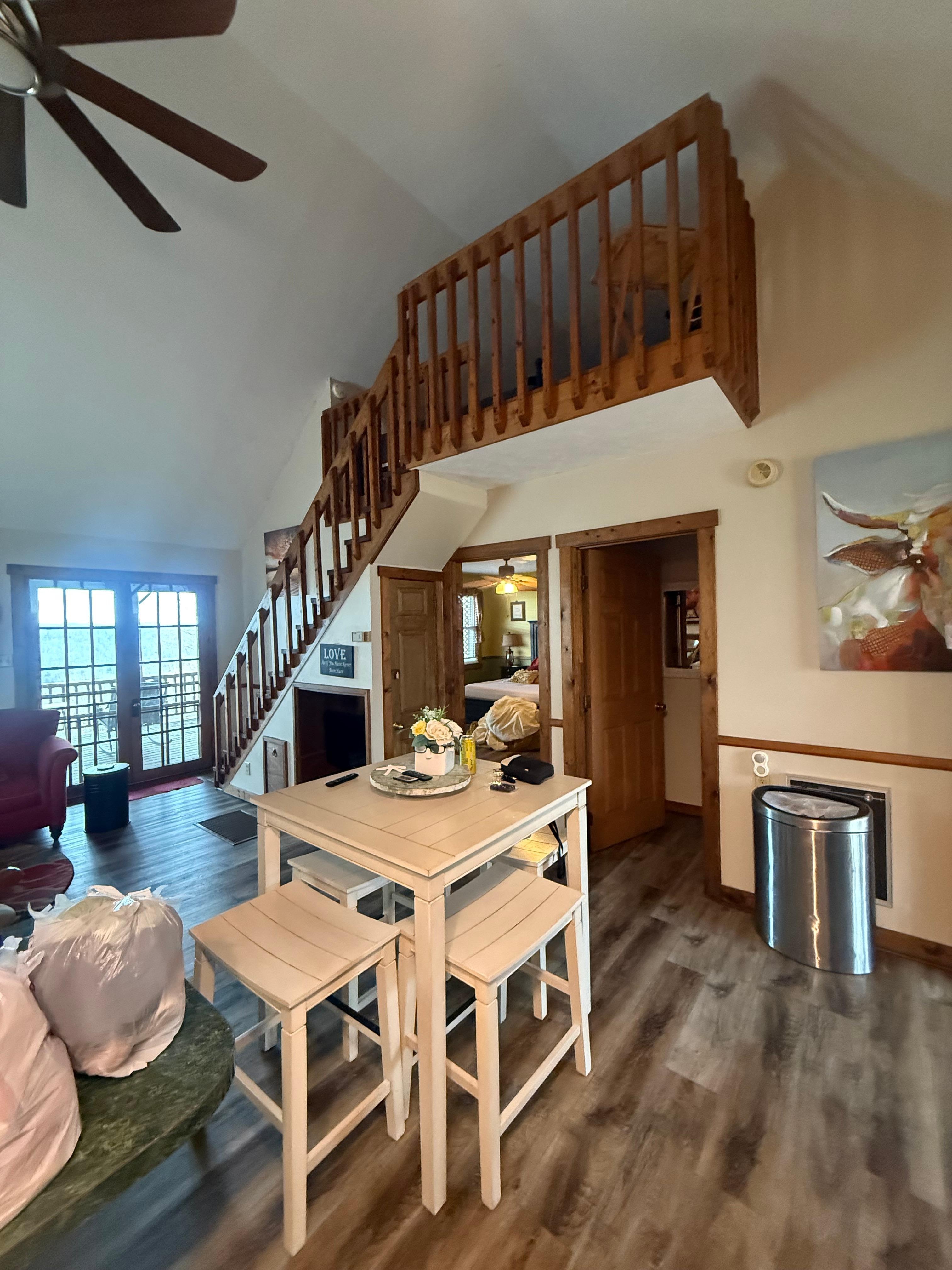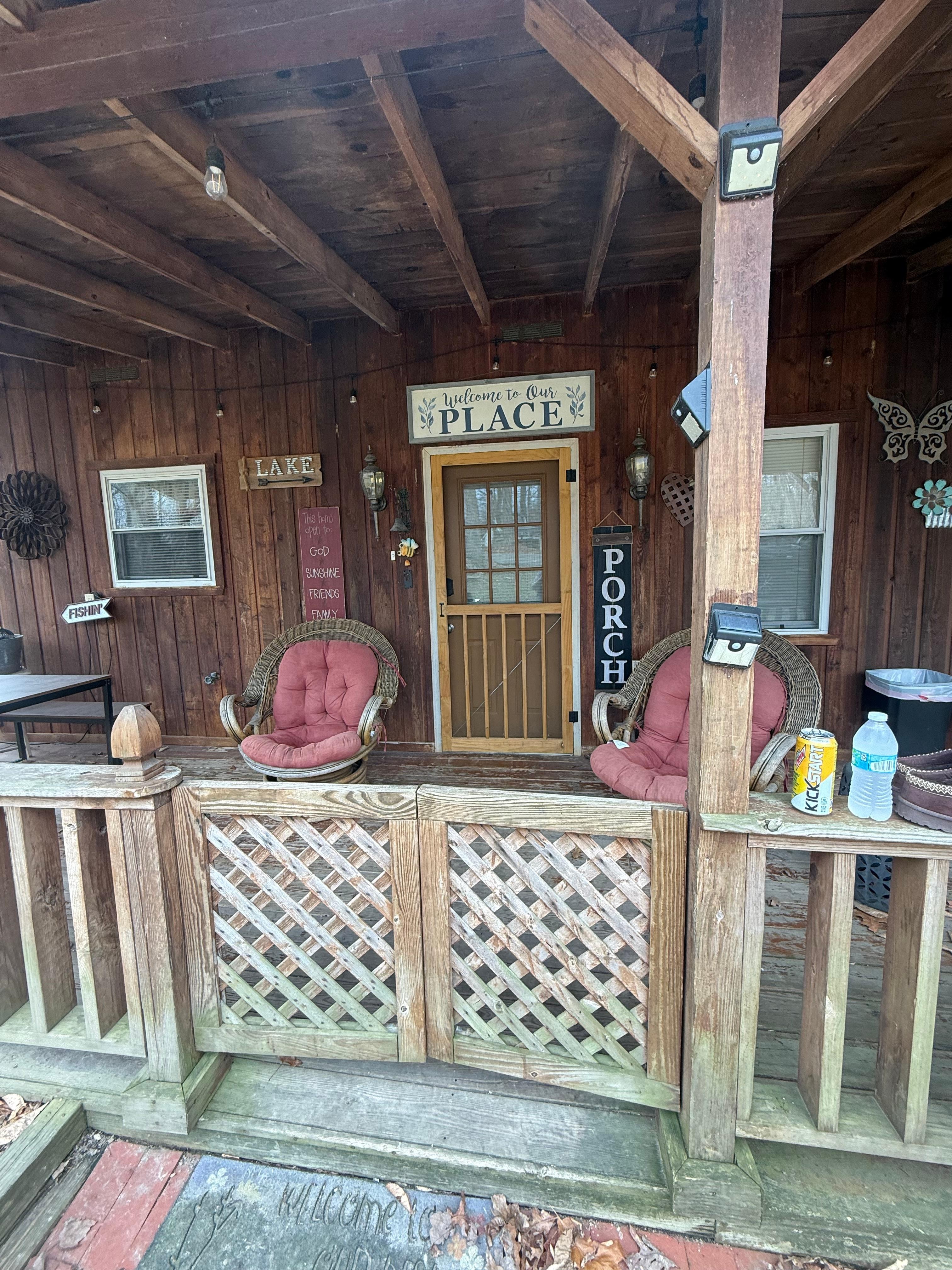 Welcome to our quaint Cabin! Super cute and comfortable fully equipped cabin! When you drive up you will find a great view plenty of parking for all the your boats and toys! The large front covered porch offering plenty of seating. Once you enter the Cabin you will be very delighted to find a very open and airy living space offering cathedral ceiling and an awesome lake view! The eat-in kitchen is fully equipped and has plenty of seating, dining table and bar area. The kitchen is open to the living room. There is a large second full bath that also offering a laundry area as well. The first floor large Primary bedroom has a very comfortable King size bed and private bath that has a beautiful lake view to wake up to! Second floor bedroom offers two queen size beds. There is very large covered rear deck with plenty of seating to sit and enjoy the lake and mountain views and watch the boats go by. If you’re a early riser, you just may spot wild life feeding in the yard. Also under the rear deck area there is a ping pong table, portal basket ball hoop (bring your ball) corn hole game and large Jenga game and a fire pit is in the front yard. Sunset Marina & beach within 7 min drive. You wont want to leave this tranquil cozy cabin, very serene! Enjoy your stay!