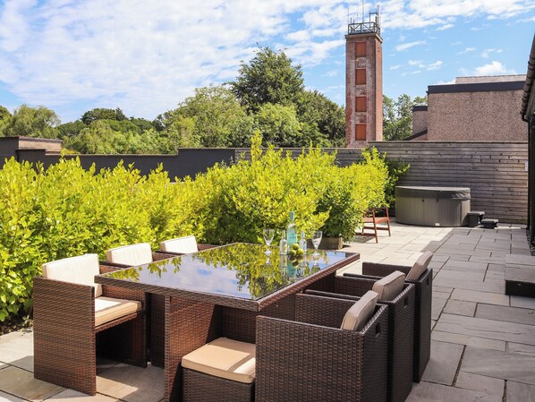As you step inside, you’ll find two living rooms, each offering a unique ambiance. One of the living rooms features a double sofa bed, perfect for extra guests, while the second living room boasts a warm wood burner, creating an inviting atmosphere for relaxing evenings. The ground floor also includes a convenient bedroom. The heart of the home is the kitchen/dining room, well-equipped with modern appliances and stylish furnishings. This space opens to the rear enclosed garden, a haven for dog owners and those who enjoy outdoor dining. Here, you’ll also find a luxurious hot tub, perfect for unwinding after a day of exploration. The utility room and a ground floor toilet add to the convenience, while a well-appointed bathroom on the ground floor features both a bath and a separate shower, catering to all preferences. Ascending to the first floor, you’ll discover three tastefully decorated bedrooms. One of these is accessed via a separate staircase and comes with an en-suite bathroom, providing added privacy and comfort. The other two bedrooms share a bathroom equipped with a shower cubicle, ensuring ample facilities for all guests.