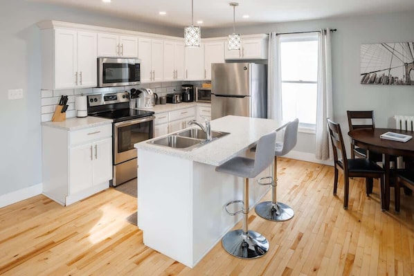 Dining Options: Cozy breakfast bar with stools and a dining table that seats four.