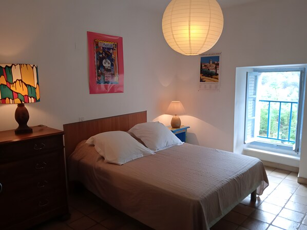 The house features two main highlights: two terraces—including one shaded by mulberry trees and wisteria—and a separate bedroom with its own bathroom. The main house includes two bedrooms, a bathroom, a fully equipped kitchen for preparing meals, and a dining area. A TV is provided for your relaxation.