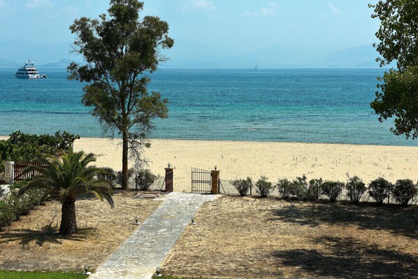 Offering unobstructed, breathtaking sea view of the magnificent deep blue of the Ionian Sea the guests can enjoy a private access to the sea. Having been sandy and shallow the sea is child friendly.