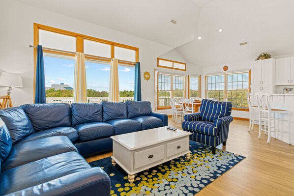 The Great Room includes the living area with flat-screen TV for the living area with flat screen TV and dining area (seats 8) with a kitchen and island (seats 3). The Ships Watch is a separate sitting area for privacy with a small desk. There is access to the wide sun deck which offers nice views of the surrounding neighborhood and the ocean breeze. A King Master Suite has a flat-screen TV and deck access also; its master bath has a shower/tub combo. On the landing down to the mid level, there is a half bath available. [Note: gas fireplace is not available for guest use.]