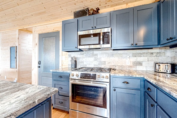 After a day out and about in the Tennessee foothills, return home to a two-story living space full of country charm and modern comfort. The open upper floor features a beautiful kitchen with stainless steel appliances and ample seating for home-cooked meals (at the kitchen island, the breakfast bar, and the dining table). From every corner, you'll have a panoramic view of the lake through a rear wall of glass.