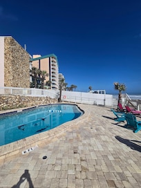Yes, this property has an outdoor pool. Pool access is from 8:00 AM to 10:00 PM.