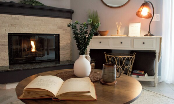 Curl up on the plush sleeper sofa by the fireplace, stream your favorite shows, or journal with tea in hand. Soft lighting and layered textiles complete the cozy ambiance.